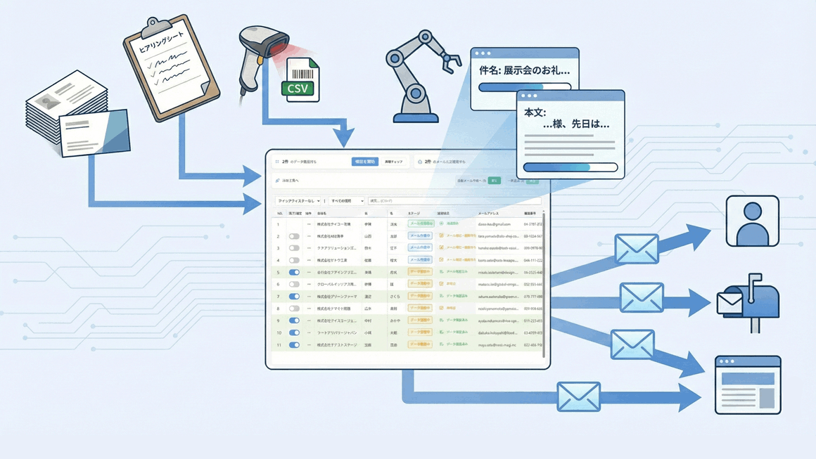 名刺・ヒアリングシートのデータ化から個別メールの自動送信までをサポートするシステム。 面倒な後処理はAIに任せ、 取りこぼしなく全てのリードを優良顧客へ。