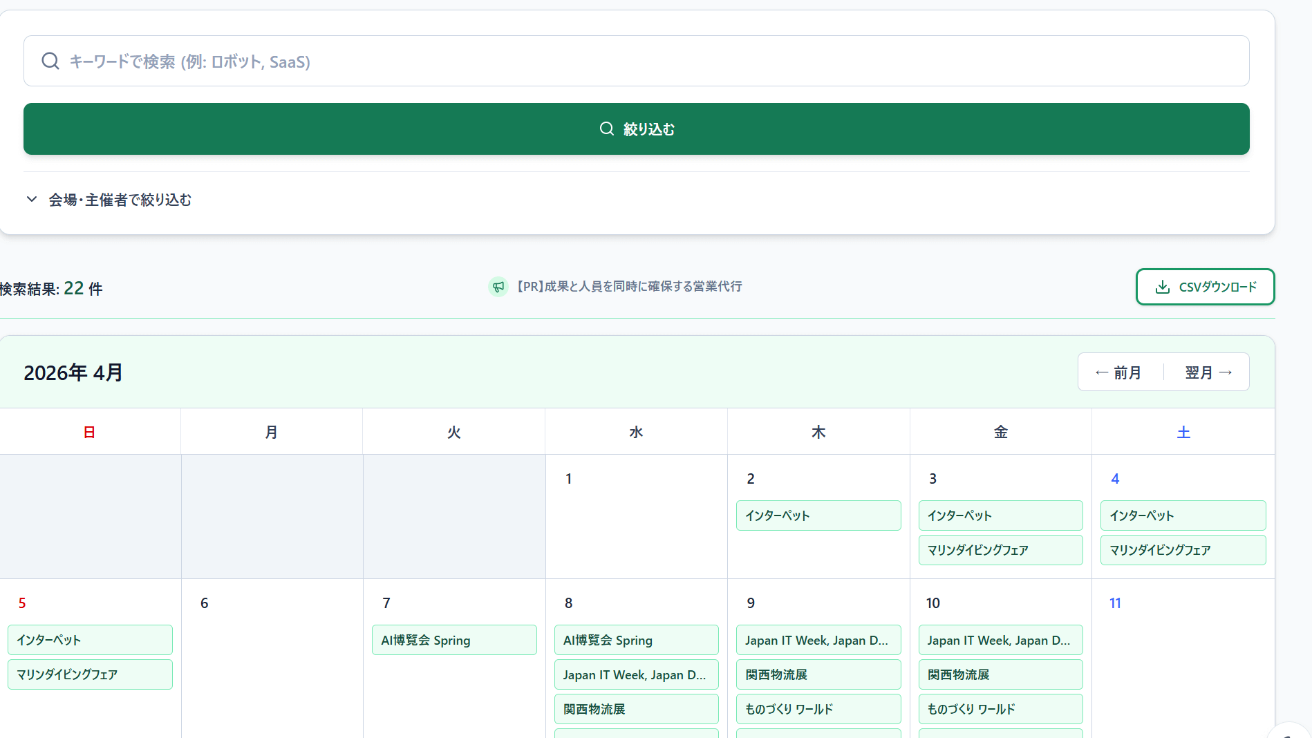 Kaboot社内でも使っている展示会カレンダーを公開しています。 主催者や会場、キーワードで展示会の検索機能もあります。 検討リストを作ったりcsvでダウンロードしたりできるので社内共有も簡単です。